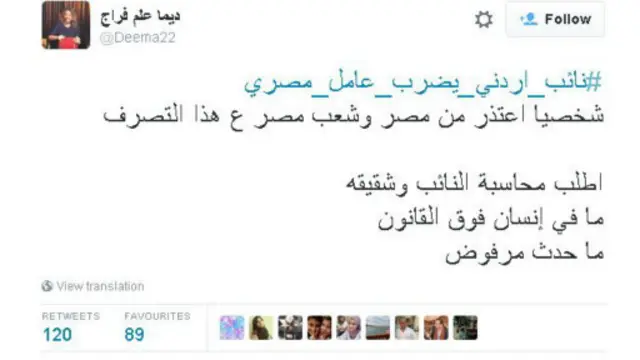 وانتشر الفيديو الذي جرت أحداثه في أحد مطاعم محافظة العقبة جنوب الأردن، على مواقع التواصل الاجتماعي، حيث جاءت تعليقات المغردين الأردنيين والمصريين في مجملها منددة بما حدث، مطالبة بمحاسبة النائب ومرافيقه.