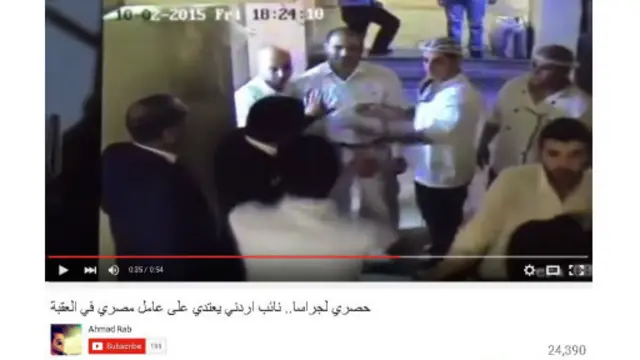 تداول مغردون أردنيون مقطعا مصورا لمرافقي نائب في البرلمان الأردني، وهم يعتدون على وافد مصري بحضور النائب الذي لم يحرك ساكنا، حسب ما نقلته وسائل إعلام محلية أردنية.