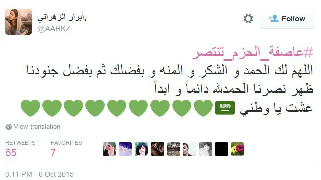 أطلق مغردون خليجيون هاشتاغ بعنوان " #عاصفه_الحزم_تنتصر " ناقشوا من خلاله تطورات الأحداث على الساحتين السياسية، والعسكرية في اليمن.
