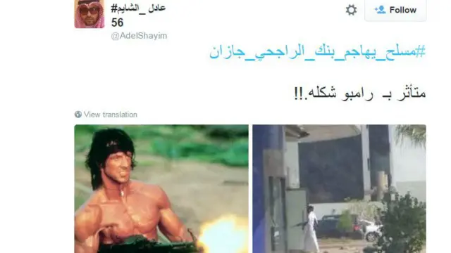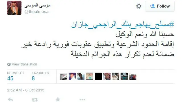 وعبر المغردون عبر هاشتاغ #مسلح_يهاجم_بنك_الراجحي_جازان عن استيائهم من هذه الحادثة وطالبوا بإنزال أشد العقوبة على مرتكيبه، بينما تندر آخرون بالحادثة.