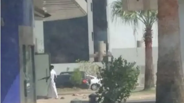 تداول مغردون سعوديون مقاطع مصور لسطو مسلح من قبل شخص يحمل سلاحا رشاشاً على مصرف في مدينة جازان جنوب غربي السعودية .