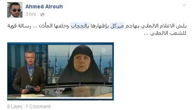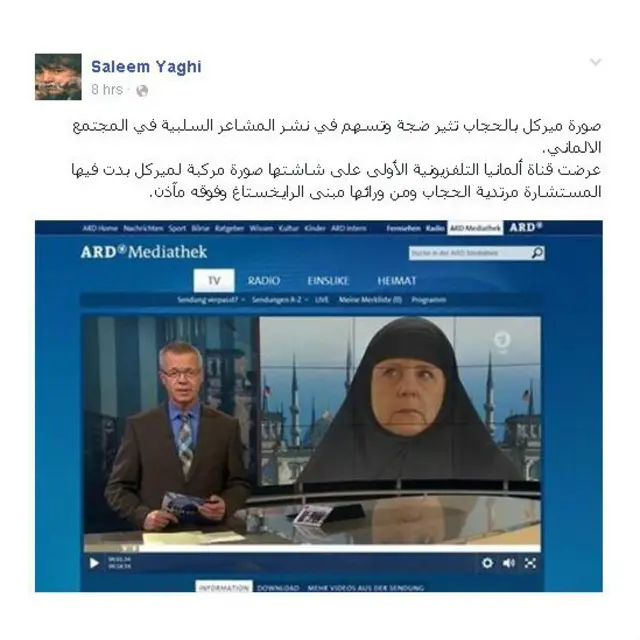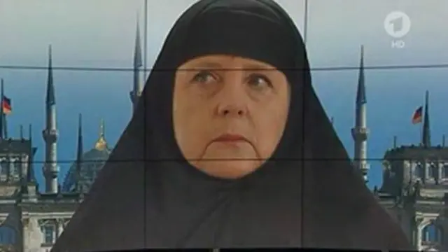 أثارت صورة مركبة على "فوتوشوب" عرضتها محطة تلفزيونية ألمانية، تظهر المستشارة الألمانية أنجيلا مريكل وهي ترتدي الحجاب ومن ورائها مبنى البرلمان الذي اعتلته المآذن - أثارت جدلا عبر مواقع التواصل الاجتماعي.