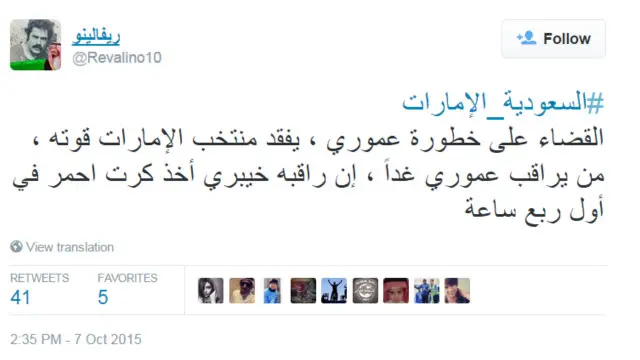 في الوقت نفسه، يقول المستخدم الذي أطلق على نفسه ريفالينو متحدثا عن اللاعب الإماراتي عمر عبد الرحمن العمودي: "#السعودية_الإمارات القضاء على خطورة عموري، يفقد منتخب الإمارات قوته، من يراقب عموري غدًا، إن راقبه خيبري أخذ كرت أحمر في أول ربع ساعة".