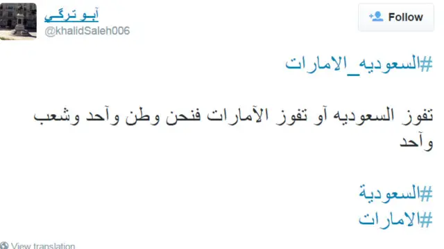 وقال المستخدم "أبو تركي": "#السعودية_الإمارات. تفوز السعودية أو تفوز الإمارات فنحن وطن واحد وشعب واحد #السعودية #الإمارات".