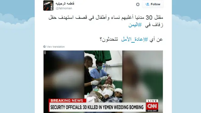 وعلى صعيد الاحداث في اليمن، والحملة التي تشنها قوات التحالف بقيادة السعودية ضد القوات الحوثية في البلد، اهتم المستخدمون صباح الخميس بالأنباء التي تداولت قصف لحفل زفاف في منطقة خاضعة لسيطرة معارضي الرئيس اليمني المعترف به دوليا عبد ربه منصور، ما اسفر عن مقتل 15 شخصا.