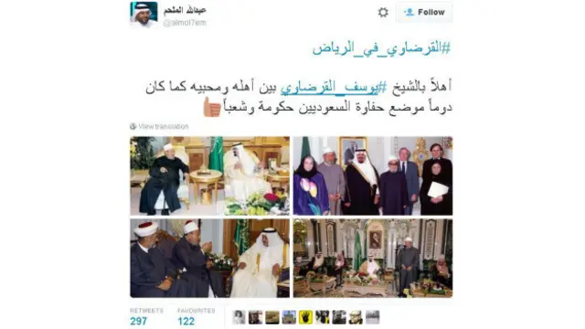 فيما وصف عبد العزيز الشيخ هذه الخطوة، في حال حدوثها، بـ "الإجابية" وأيده في ذلك عبد الله الملحم الذي غرد مرحبا بزيارة القرضاوي.