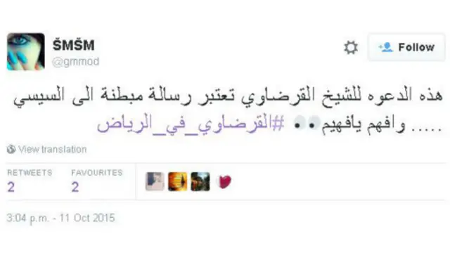 حاز هاشتاغ بعنوان "#القرضاوي_في_الرياض " اهتمام مستخدمي تويتر في عدد من الدول الخليجية ومصر، عقب توارد أنباء تزعم بتلقي رئيس الاتحاد العالمي لعلماء المسلمين يوسف القرضاوي، دعوة لحضور اجتماعات المجمع الفقهي في الرياض.
