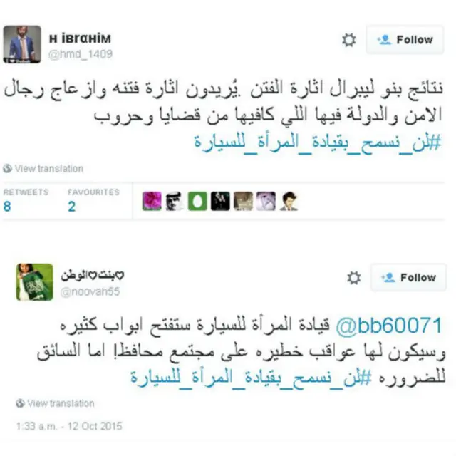 وما بين مدافع ومؤيد لقانون حظر قيادة المرأة للسيارة، تباينت آراء المغردين حول فكرة هاشتاغ "#لن_نسمح_بقياده_المراه_للسيارة"، فمنهم من دعا للتصدي لداعمي حملة مسيرة أكتوبر للقيادة، كالمغرد إبراهيم الذي شدد على احترام قوانين البلاد.