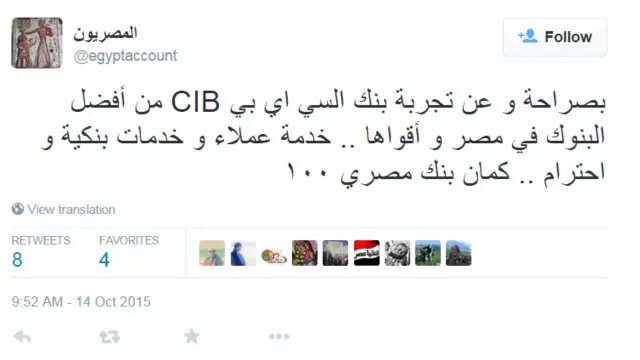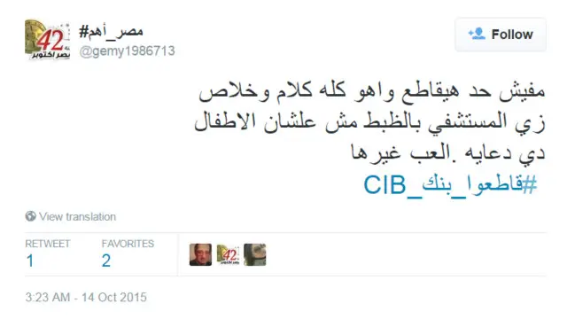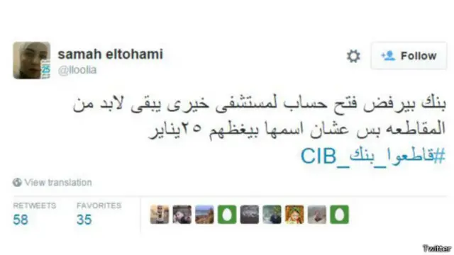 اهتم مستخدمو تويتر في مصر باتهامات وجهها صحفي للبنك التجاري الدولي (CIB) تدعي بأن المصرف رفض فتح حساب لصالح بناء مستشفى 25 يناير الخيرية بمحافظة الشرقية لأسباب سياسية.
