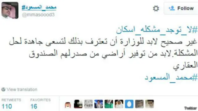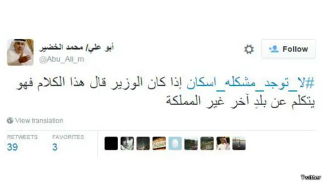 انشغل مستخدمو تويتر في السعودية بهاشتاغ #لا_توجد_مشكله_اسكان لمناقشة أزمة السكن في البلاد وذلك بعد انتشار تصريحات على مواقع التواصل الاجتماعي نسبت لوزير الإسكان السعودي تفيد بأن البلاد لا تعاني من "خلل في مشكلة توفر الاسكان".