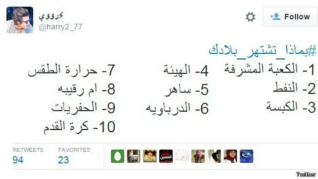 تداول مغردون في عدد من الدول العربية هاشتاغ #بماذا_تشتهر_بلادك للحديث عن أبرز ما يميز الدول العربية، سواء أكانت إيجابية أو سلبية. ونشط الهاشتاغ بشكل كبير في دول الخليج والأردن والجزائر ليفوق عدد التغريدات 79 ألف تغريدة.