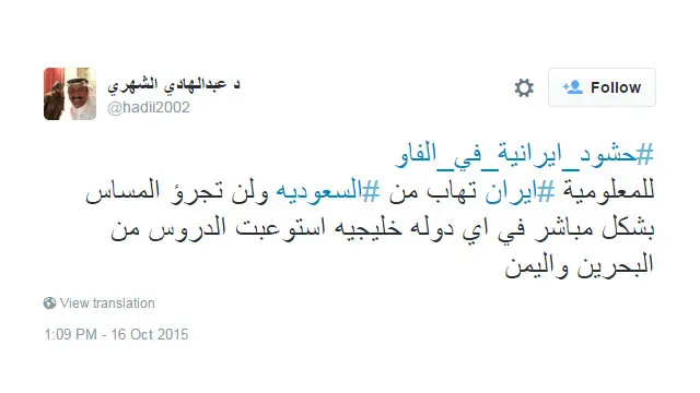 بينما قلل المغرد عبدالهادي الشهري من أهمية الخبر حيث كتب أن إيران لن تتدخل في شؤون دول الخليج بسبب خشيتها من التداعيات المحتملة لأي تدخل. وتفاعل العديد من المستخدمين مع هذه التغريدة وكانت الآراء بين مؤيد لما قاله الشهري واخرى معارضة.