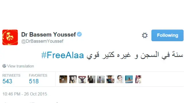 بينما أشار الإعلامي الساخر باسم يوسف إلى المعتقلين الآخرين في السجون المصرية.
