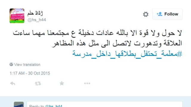 بينما التمس المغرّد F_aldai7aniii@ العذر لهذه المعلمة وكتب: "#معلمه_تحتفل_بطلاقها_داخل_مدرسه حينما يخرج الشخص من بيئة مشاحنة وضغوط نفسية وذل وهوان يكون هذا الاحتفال بمثابة علاج نفسي وتهيئة لحياة جديدة."
