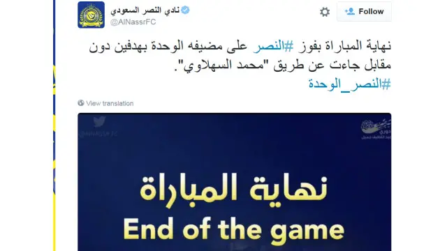 وكتب نادي النصر على حسابة بموقع تويتر: "نهاية المباراة بفوز #النصر على مضيفه الوحدة بهدفين دون مقابل جاءت عن طريق محمد السهلاوي. #النصر_الوحدة".