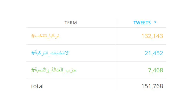 ودشن المستخدمون العرب أكثر من هاشتاغ في هذا الشأن، من بينها #الانتخابات_التركية، و#تركيا_تنتخب، و#حزب_العدالة_والتنمية، ونعرض عليكم في الرسم التوضيحي التالي عدد التغريدات التي وردت على الهاشتاغات المذكورة.
