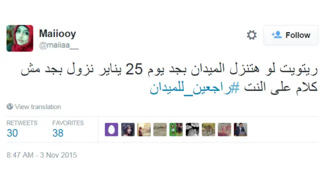 ظهر في قائمة أكثر الهاشتاغات تداولا في مصر ايضا صباح الثلاثاء هاشتاغ #راجعين_للميدان، والذي طالب عبره عدد من المستخدمين بالرجوع إلى ميدان التحرير في الـ25 من يناير، والتظاهر، احتجاجا على الأوضاع الحالية.