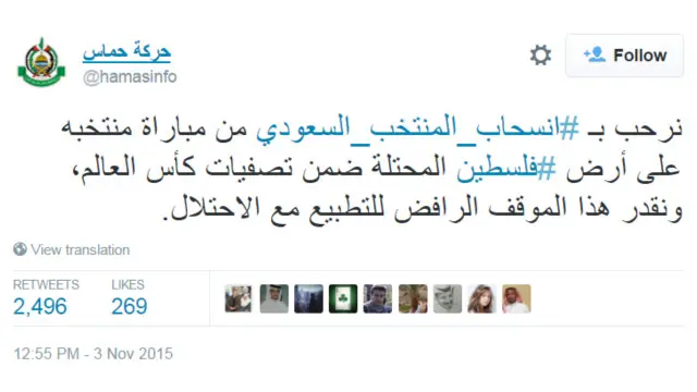 ورحبت حركة حماس بالقرار، ونشرت التغريدة التالية عبر حسابها ليتم تداولها أكثر من ألفين مرة خلال أقل من ساعتين على نشرها.