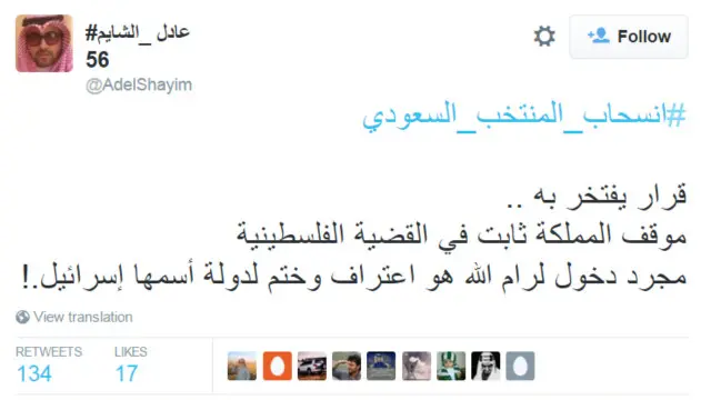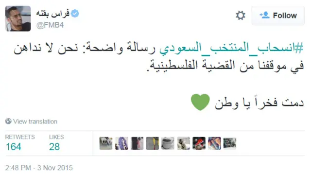 وأعلن اتحاد كرة القدم السعودي انسحاب منتخبه من أمام نظيره الفلسطيني في الجولة الخامسة بالتصفيات المشتركة المؤهلة إلى كأس العالم 2018 وكأس آسيا 2019، والتي كانت مقررة يوم الخميس المقبل بمدينة رام الله، التي تقع في الضفة الغربية المحتلة.