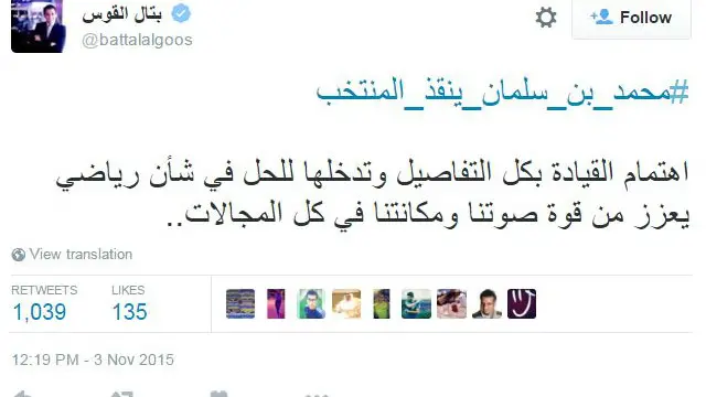 أطلق مغردون في السعودية هاشتاغ #محمد_بن_سلمان_ينقذ_المنتخب للإشادة بولي ولي العهد محمد بن سلمان، بعد انتشار انباء افادت بتدخله في نقل مباراة كرة قدم بين السعودية وفلسطين إلى الأردن.