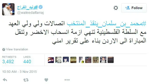 جاء هذا بعد انسحاب منتخب السعودية من مباراة مؤهلة لكأس العالم القادم كان من المقرر إجراؤها الخميس في رام الله.