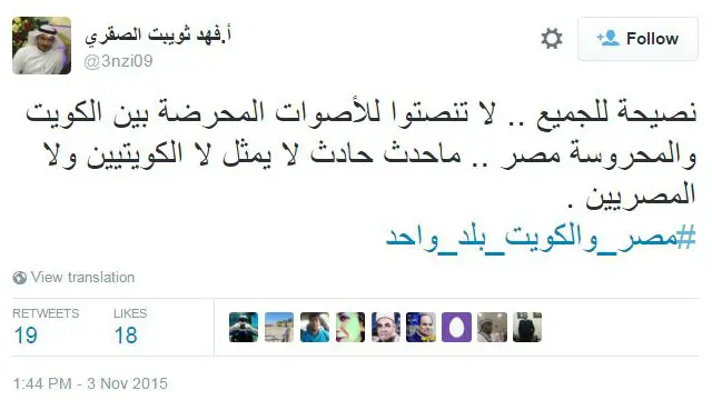 كما اطلقت فئة أخرى من المغردين هاشتاغ مضاداً وهو #مصر_والكويت_بلد_واحد، حاولوا من خلاله تهدئة الوضع والتأكيد على متانة العلاقات بين البلدين والشعبين.