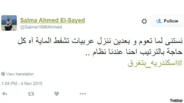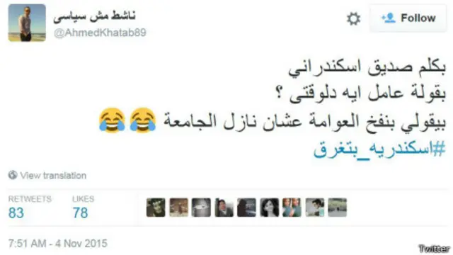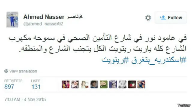 أطلق مغردون في مصر هاشتاغ #اسكندرية_بتغرق الذي ظهر في أكثر من ألف تغريدة، وذلك بعد إعلان حالة الطوارئ في مدينة الإسكندرية بسبب هطول الأمطار الغزيرة.