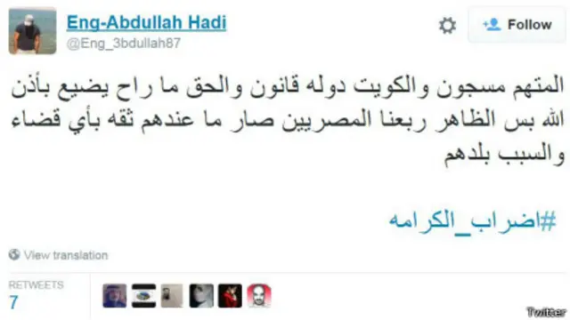 تفاعل مغردون مصريون وكويتيون مع هاشتاغ #اضراب_الكرامة الذي دعا إلى إضراب المصريين المقيمين في الكويت عن العمل، وذلك بعد انتشار مقطع فيديو على مواقع التواصل الاجتماعي لشجار بين عامل مصري ومواطن كويتي، انتهى بدهس المصري بسيارة.