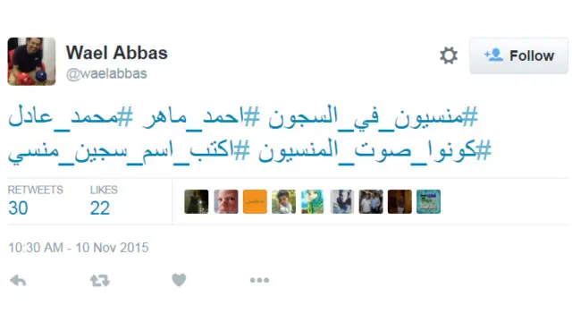 وانتشر هاشتاغ #اكتب_اسم_سجين_منسي الثلاثاء، ويبدو إن من كان وراء تدشينه هو المدون المصري والناشط وائل عباس، إذ ظهر الهاشتاغ لأول مرة في تغريدته التالية.