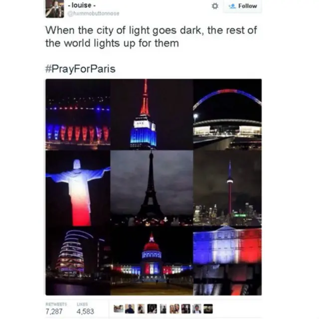 وتدوال مغردون صورا لبرج ايفيل وهو يتشح بالسواد ويطفئ أنواره حدادا على ضحايا الهجمات، فيما نشر آخرون صورا لمعالم سياحية حول العالم وقد زينت بالأعلام الفرنسية.