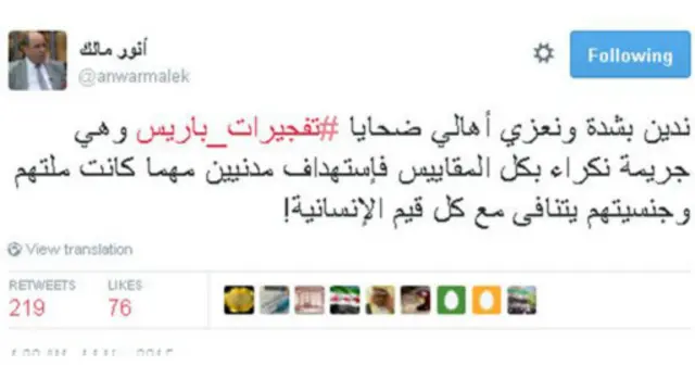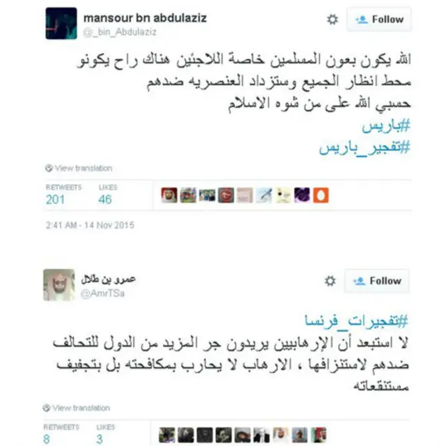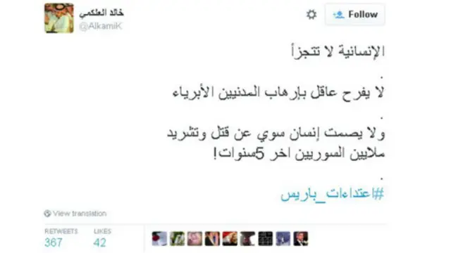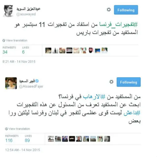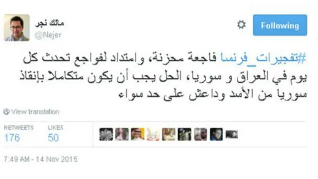 ومع انتشار هاشتاغ #prayforparis المتضامن مع فرنسا، نشطت مجموعة هاشتاغات من قبيل #prayforbaghdad وprayforlebanon# أشار مغردون من خلالها إلى أن ما يحدث سوريا والعراق وغيرها من دول العالم لا يقل أهمية عما حدث في باريس البارحة، إذ يعيش أهلها تحت وطأة الحروب والصراعات منذ سنين.