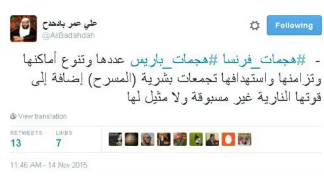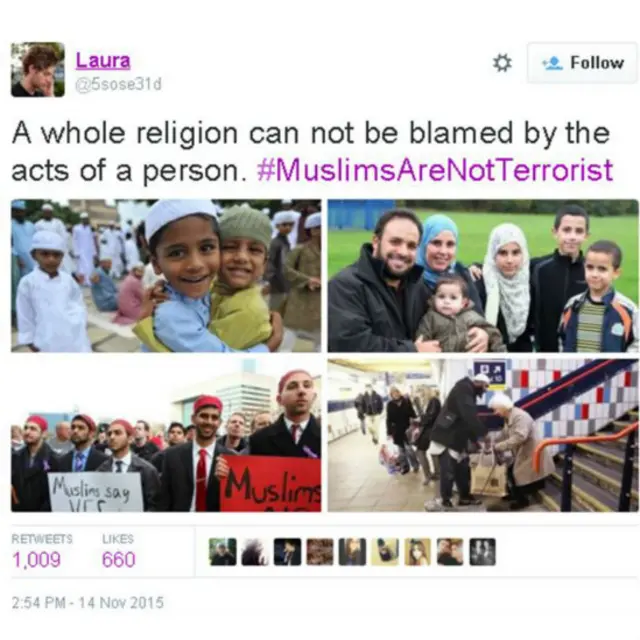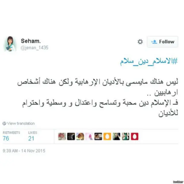 وقد تصدر هاشتاغ #الاسلام_دين_سلام، #MuslimsAreNotTerrorist تعليقات مستخدمي تويتر العرب والمسلمين، بعد تبني تنظيم الدولة الإسلامية مسؤولية الهجوم .