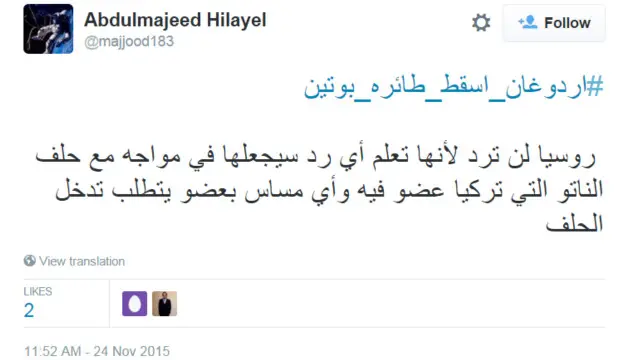 فغرد أحدهم قائلا : "اسقاط الطائرة الروسية هو اول اشتباك عسكري بين دولة عضو بحلف الناتو وبين روسيا او حتى الاتحاد السوفييتي سابقاً."