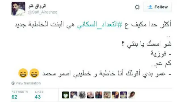 وطالبت المغردة شيماء البخيت بالتعامل مع التعداد بجدية والتعاون مع المسؤولين، فكتبت: "للعلم بس لكل من يتناول الموضوع بسخرية ولا يتعاون الموضوع مهم ويبنى عليه دراسات وأحجام مشاريع".