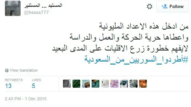 أثارت دعوة أطلقها مغردون لطرد السوريين من السعودية جدلاً حادا على تويتر. حيث أعرب العديد من المغردين عن رفضهم للدعوة التي أطلقت عبر هاشتاغ #أطردوا_السوريين_من_السعودية، مؤكدين تضامنهم مع السوريين وترحيبهم بهم في المملكة.