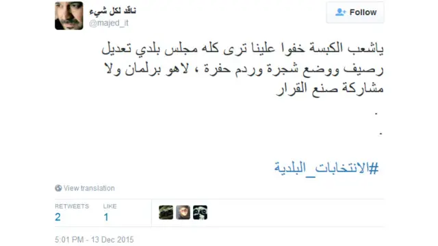 من جهة أخرى، قلل مغردون من أهمية انتخابات المجالس البلدية، كون دورها ينحسر في تسيير الخدمات الاجتماعية ولا يحدث أي فرق في صناعة القرار.