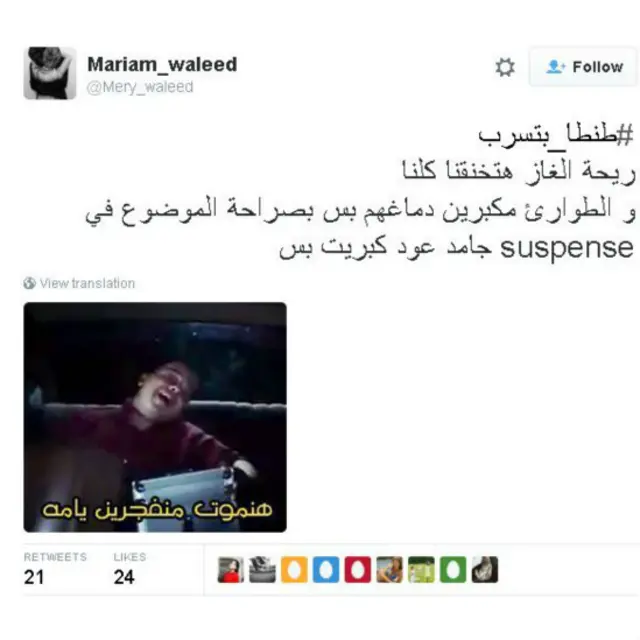 وكتبت إيمان حافظ في تدوينة لها على فيسبوك: " #تسرب غاز في طنطا والطوارئ تغلق الهواتف، ولسه لما نعمل المفاعل النووي و تحصل حاجة مثل هيروشيما فكرة والفكرة لاتموت ."