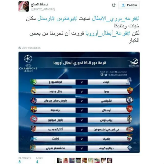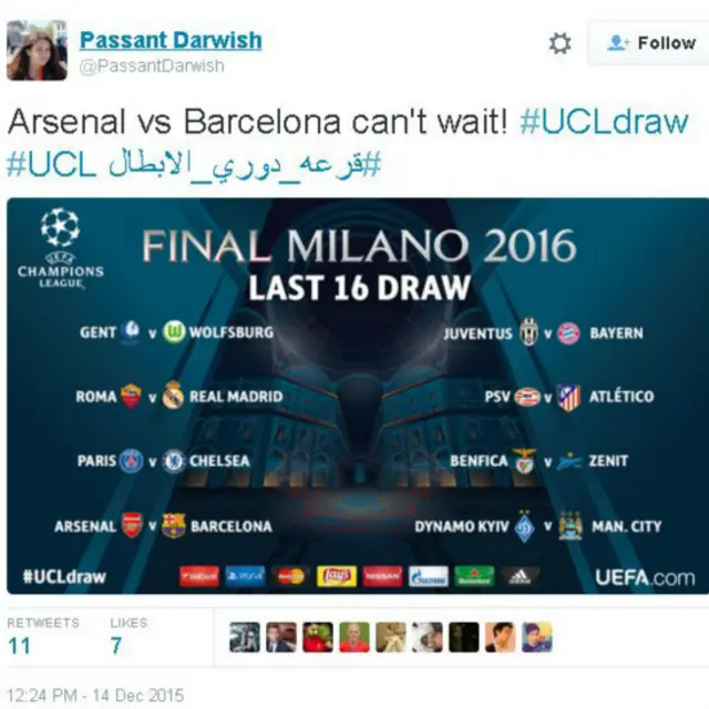 وكالعادة سارع مغردون حول العالم بمناقشة نتائج القرعة من خلال هاشتاغ #UCLdraw و#قرعه_دوري_الأبطال ، اللذين ظهرا في أكثر من 14 ألف تغريدة.