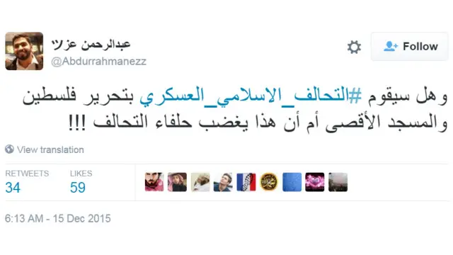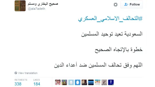 ولاقت الأنباء عن ذلك التحالف ترحيبا واسعا من مستخدمي موقع التواصل الاجتماعي في عدة دول، كانت السعودية في مقدمتها، وانتشر هاشتاغ #التحالف_الاسلامي_العسكري بصورة كبيرة صباح الثلاثاء.