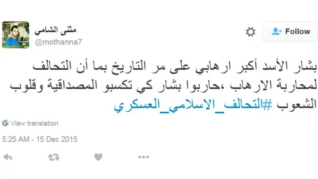 وطالب مغردون ذلك التحالف الجديد باستهداف بشار الأسد، واسرائيل.