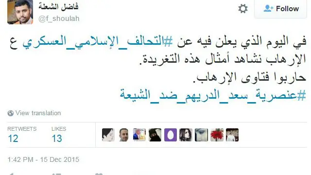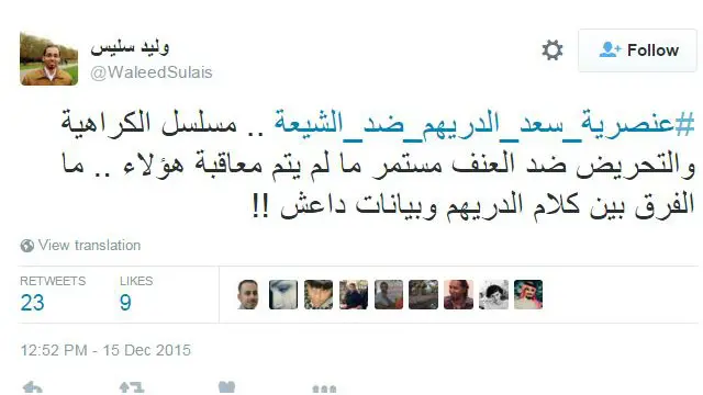 وأطلق مغردون #عنصرية_سعد_الدريهم_ضد_الشيعة الذي هاجموا من خلاله الدريهم معتبرين أن ما يقوله ينم عن فكر متطرف "لا يختلف كثيراً عن فكر داعش"، على حد قول المدون وليد سليس.