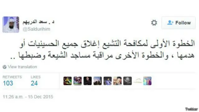 أثارت تغريدة كتبها الشيخ السعودي سعد الدريهم على حسابه الخاص على تويتر جدلاً واسعاً بين المغردين. وكان الدريهم قد دعا في تغريدته إلى "إغلاق أو هدم جميع الحسينيات ومراقبة مساجد الشيعة".