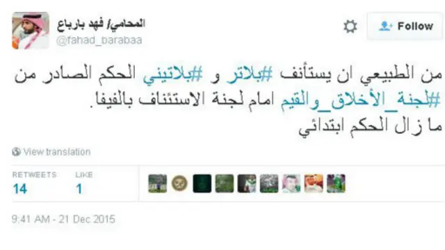 تفاعل مغردون عرب مع خبر تعليق عمل بلاتر وبلاتيني لمدة ثماني سنوات في أعقاب تحقيق أجرته اللجنة الأخلاقية في اتحاد الفيفا، من خلال هاشتاغ #إيقاف_بلاتر_وبلاتيني_8_سنوات.