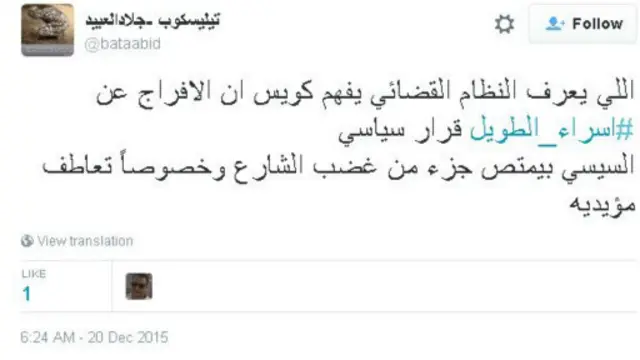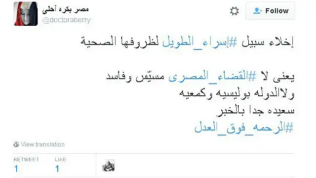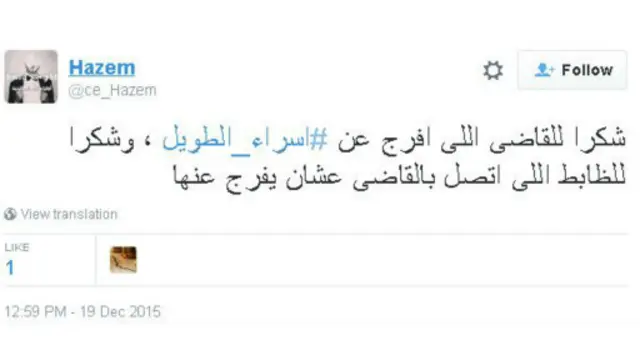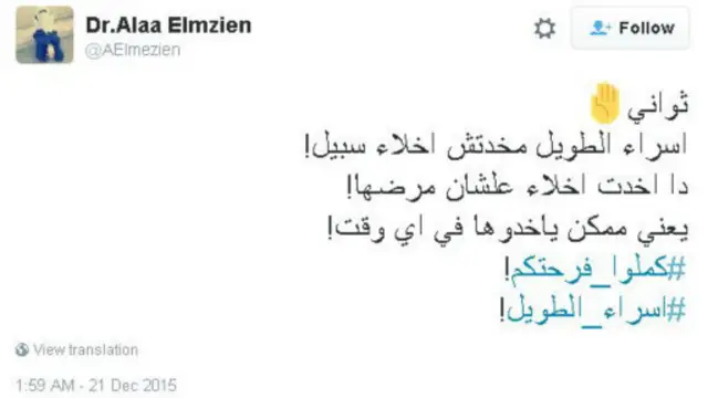 وعبر هاشتاغ #إسراء_الطويل نشر مغردون مقاطع مصورة تظهر اللحظات الأولى لإطلاق سراح الطالبة المصرية. وأعرب نشطاء عن سعادتهم بخبر إخلاء سبيل إسراء الطويل وطالبوا بإعادة النظر في أوضاع المحبوسين في السجون المصرية.