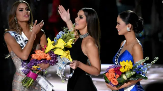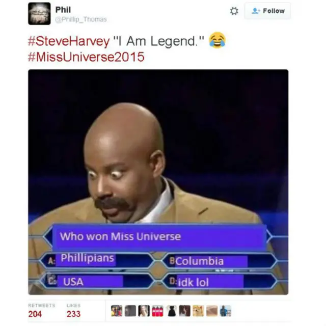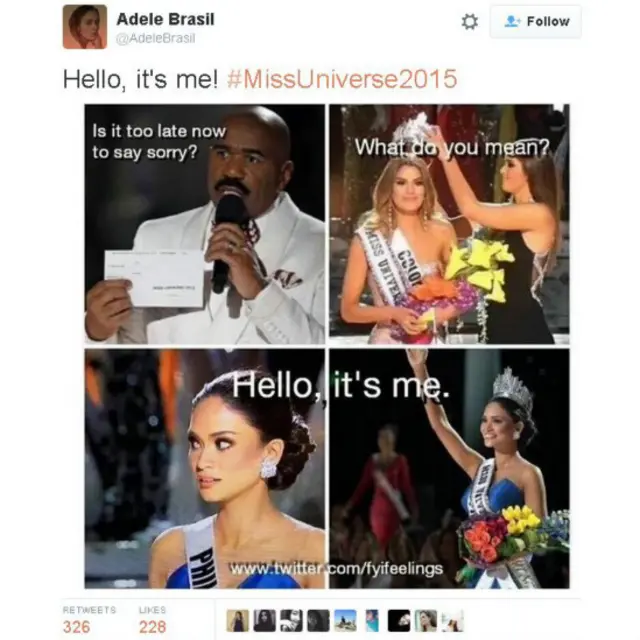 فبعد دقائق من إعلان اسم الفائزة من كولومبيا بلقب ملكة جمال الكون 2015 ، فوجئ الحضور بمقدم المسابقة ستيف هارفى يعتذر، معلنا فوز ملكة جمال الفلبين بدلا منها، لتتوالى بعدها التعليقات الساخرة عبر تويتر.