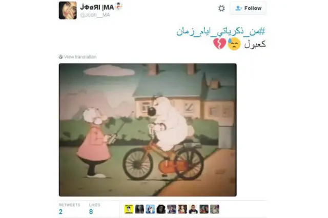 ودون مغردون أهم البرامج الكارتونية والأعمال الفنية التي كانوا يستمعون لها، فغردت إحدهن قائلة : "من ذكرياتي أيام زمان اللمة الحلوة وتوم وجيرى وعالم سمسم وتيمون وبومبا وغزل البنات و البساطة في مشاعرنا."