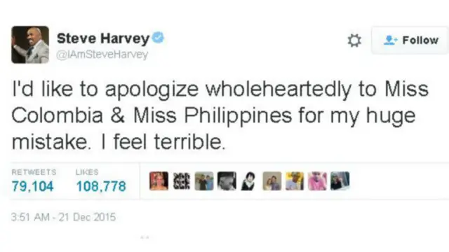 واعتذر ستيف هارفى عن الخطأ الذى ارتكبه من خلال تغريدة له عبر حسابه على موقع تويتر، قائلا: "أود أن أعتذر بصدق لملكة جمال كولومبيا وملكة جمال الفلبين عن خطئى الفادح أشعر بالاستياء".