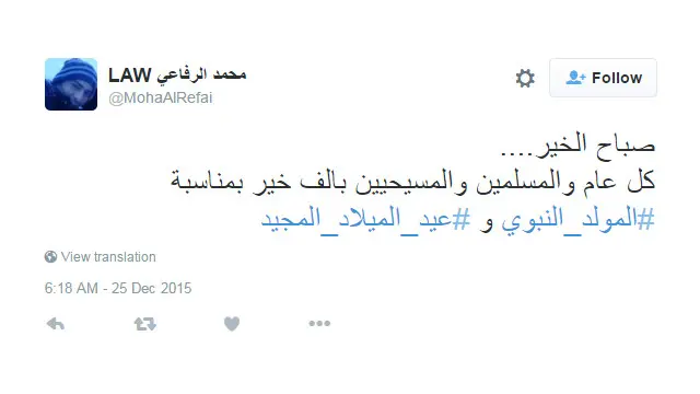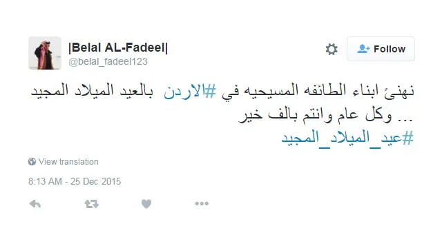 وقام بعض مستخدمي تويتر بنشر صور ومشاهد تظهر احتفالات عيد الميلاد في مختلف المدن العربية أما البعض الآخر فسلّط الضوء على أهمية التعايش المشترك بين المسلمين والمسيحين في المنطقة.