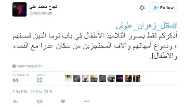 اهتم مستخدمو تويتر في العالم العربي بمقتل زهران علوش، زعيم جماعة "جيش الإسلام" الساعية لإسقاط حكم الرئيس السوري بشار الأسد، في غارة على غوطة دمشق الشرقية.