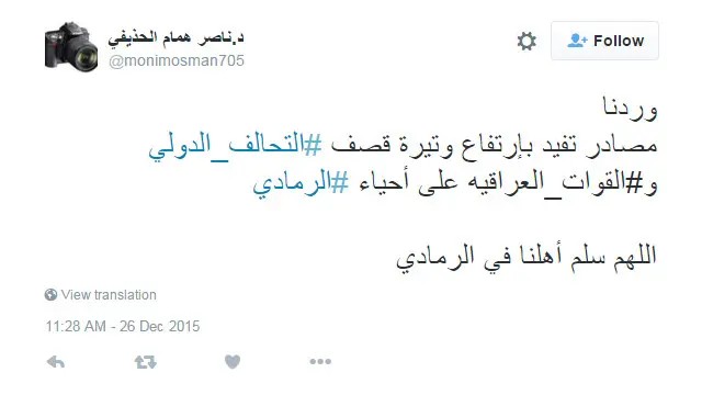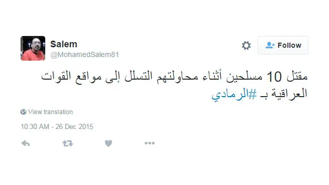 وننتقل إلى قضية اخرى، إذ أولى مستخدمو مواقع التواصل الاجتماعي اهتماما للاشتباكات الدائرة في مدينة الرمادي بين القوات العراقية ومقاتلي تنظيم الدولة الاسلامية.